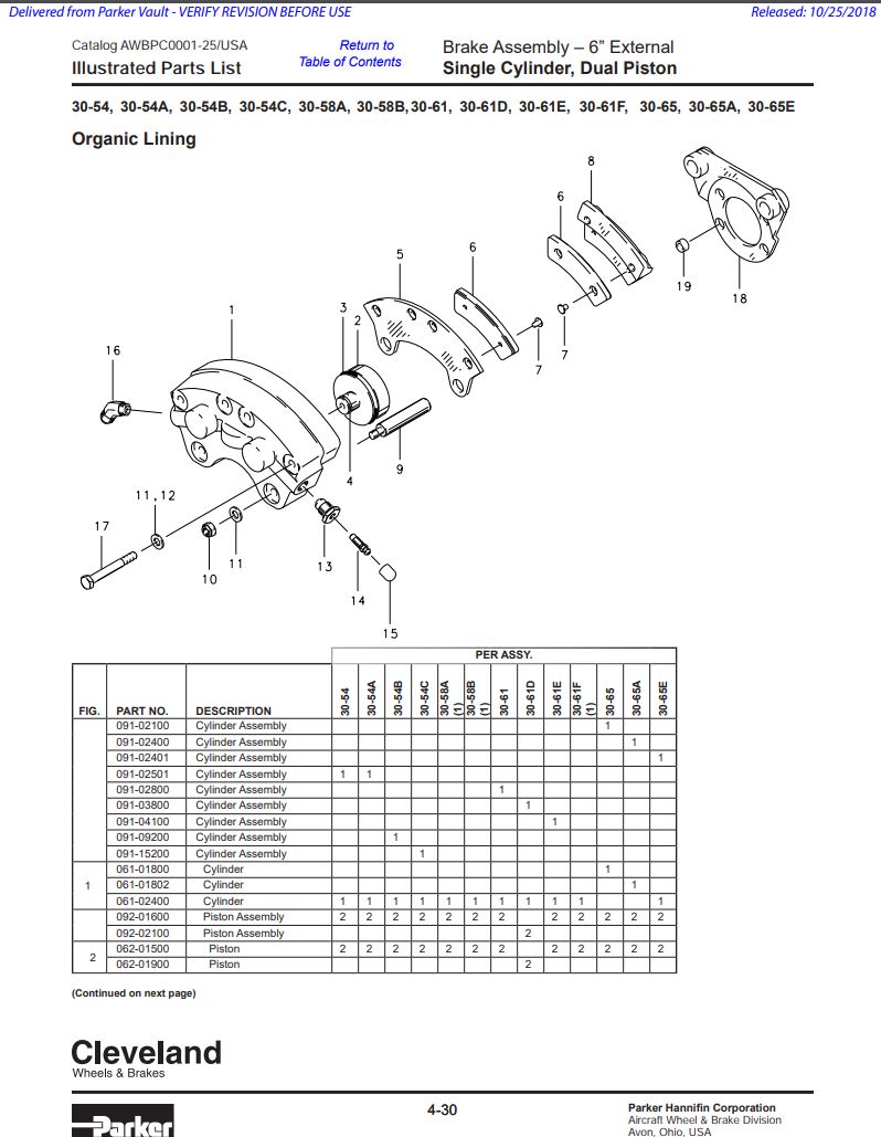 All that being said, physically, they are all identical. As near as I can tell, the 1241157-3 is a Cleveland 30-61 brake assembly. The B model and later with Brake C163030-405 is a Cleveland 30-61D brake assembly. I have attached the pages from the Parker parts breakdown, and the only difference I can find between these brakes, is the pistons are different (same size though) as they have a little spring on them. There is no difference in sizes, brake linings, etc, so my assessment is that there is no performance difference in these brakes, other than a small improvement on the piston to help keeping them from sticking...maybe?
