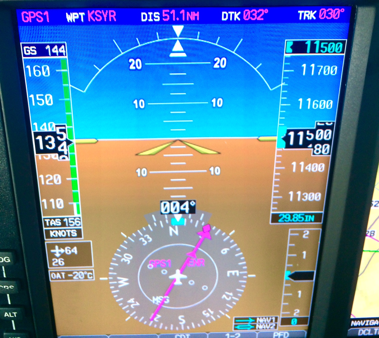 Due to the unforecast headwinds I had pulled the power back to try to meet my goal of landing with an hour's reserve. It worked out fine. Note that the TAS 156 kts minus the 26 knots headwind component shown in the lower left does not equal the 144 knot ground speed you can see on the top left. That is because the 26 knot headwind component is based on aircraft heading (004), not track (030). Headwind component of my track was 12 knots i.e. True airspeed of 156-GS 144 = 12 knots actual headwind component. Was supposed to a tailwind so it was a bit of a long flight Last edited by JamesC : 04-24-16 at 06:21 PM. |