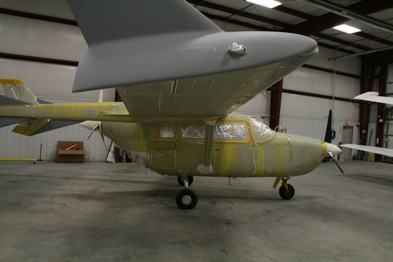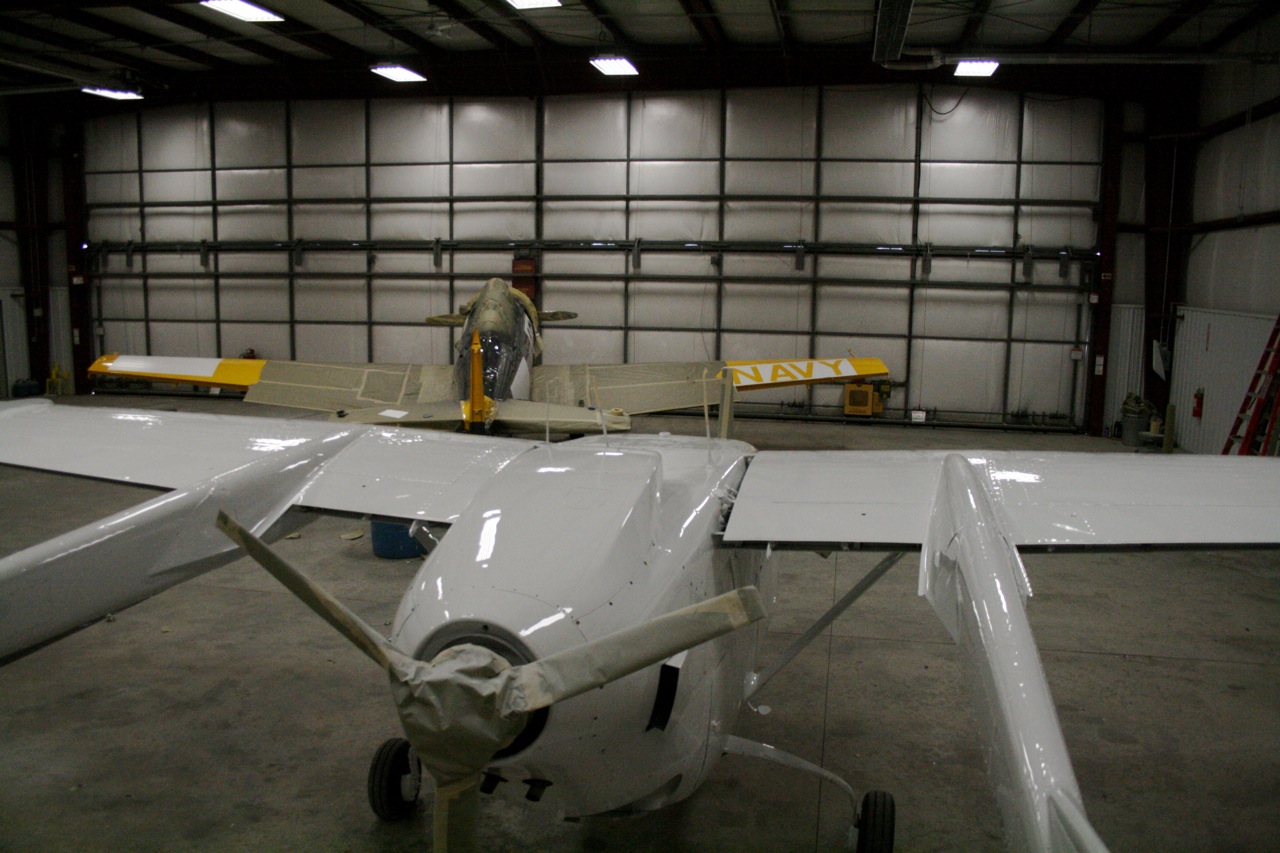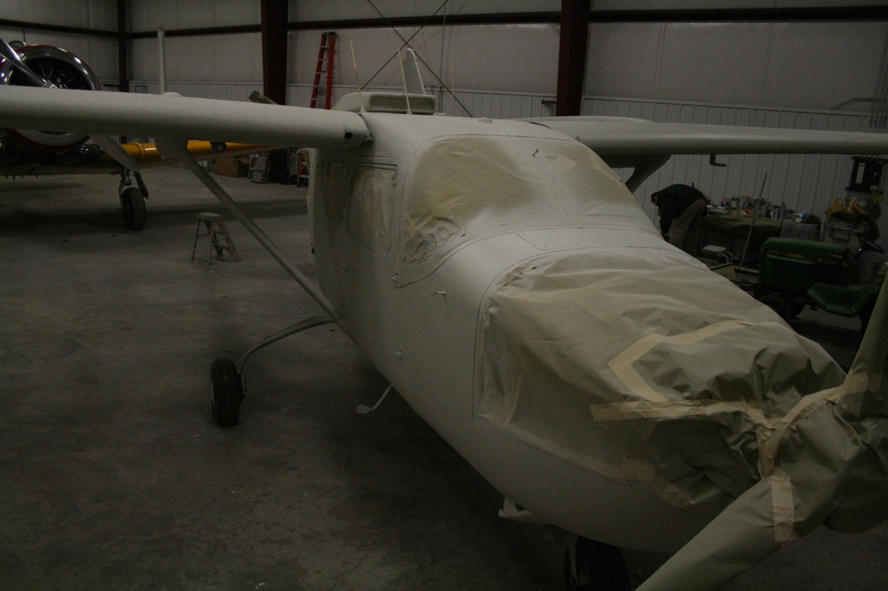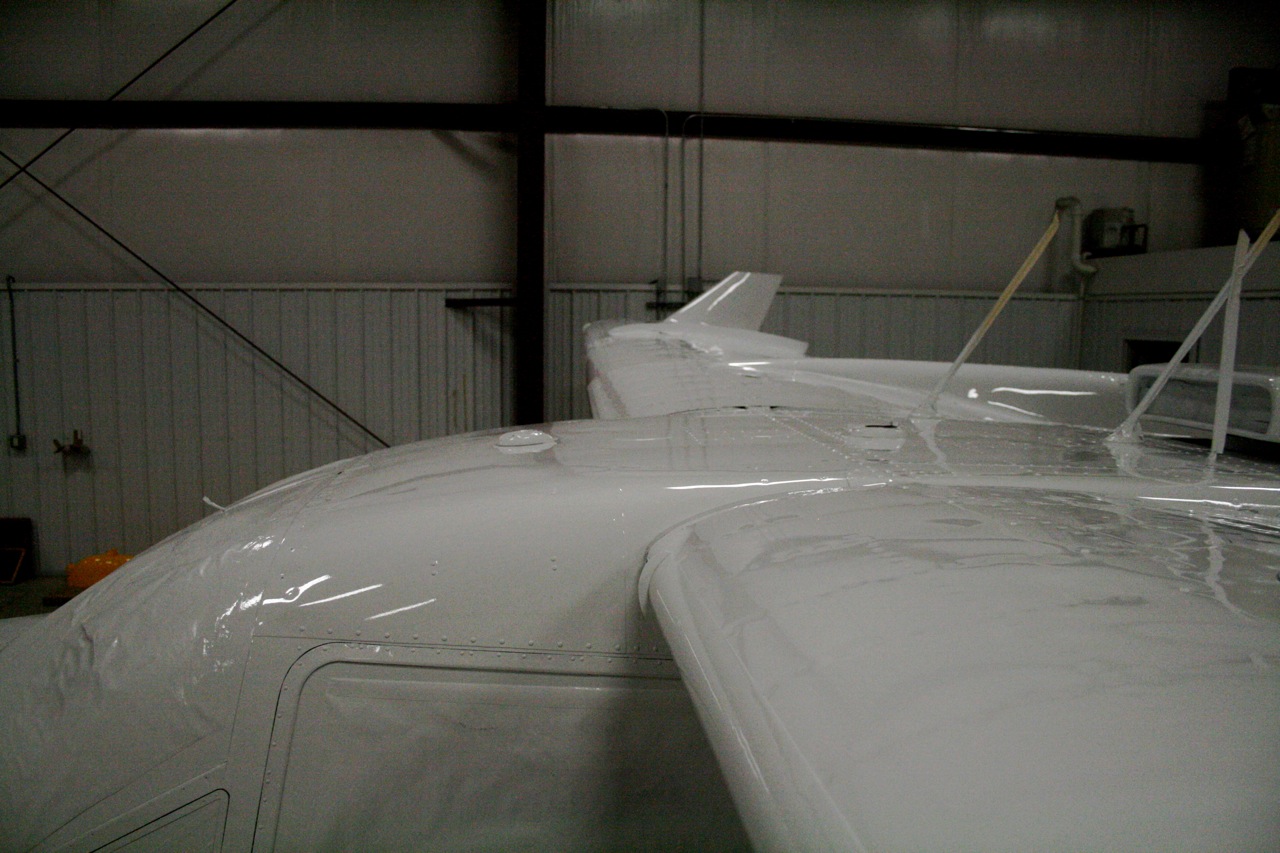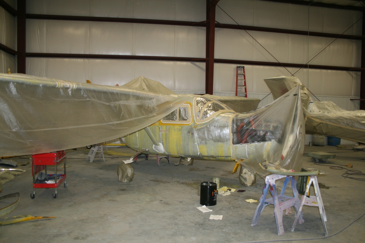 No pictures yet but the aircraft is completely stripped. They really jumped on it last week and removed all that lacquer. The lacquer has to come off because if you spray the polyurethane over lacquer it blisters and bubbles. It's bare bones metal and today they gave it the first shot of primer. Tomorrow I will go down and mount the boom fairings and wingtips so that the second sanding coat of primer can be applied. All the controls are still off and each control is painted independently on it's own. All the little dings and stuff will be filled and a third primer coat will be applied. Then on Wednesday the Matterhorn White will be applied to the entire aircraft. I will have some photos to post tomorrow night. It won't be long now.