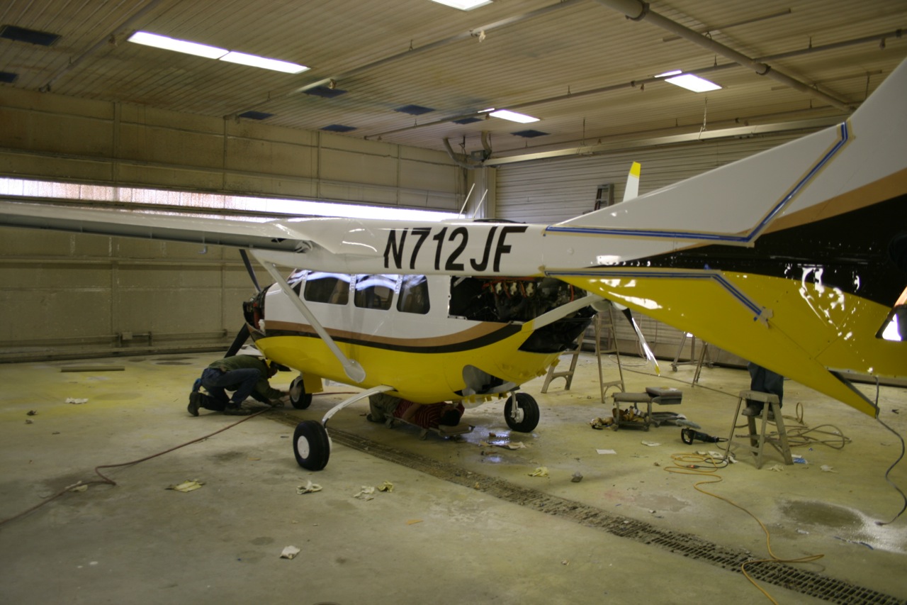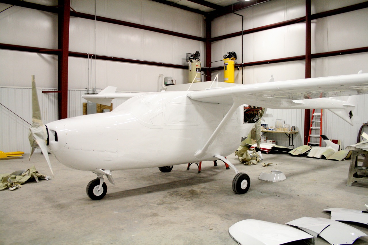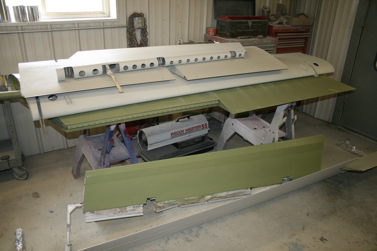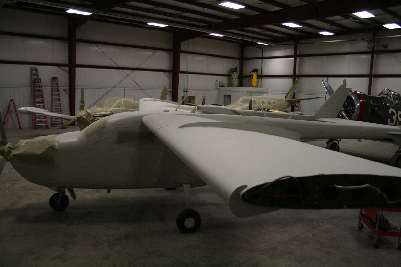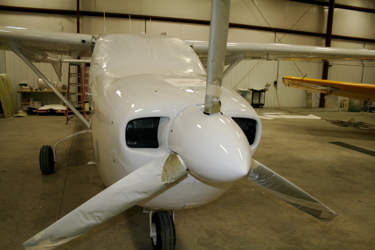 No pictures yet but the aircraft is completely stripped. They really jumped on it last week and removed all that lacquer. The lacquer has to come off because if you spray the polyurethane over lacquer it blisters and bubbles. It's bare bones metal and today they gave it the first shot of primer. Tomorrow I will go down and mount the boom fairings and wingtips so that the second sanding coat of primer can be applied. All the controls are still off and each control is painted independently on it's own. All the little dings and stuff will be filled and a third primer coat will be applied. Then on Wednesday the Matterhorn White will be applied to the entire aircraft. I will have some photos to post tomorrow night. It won't be long now.