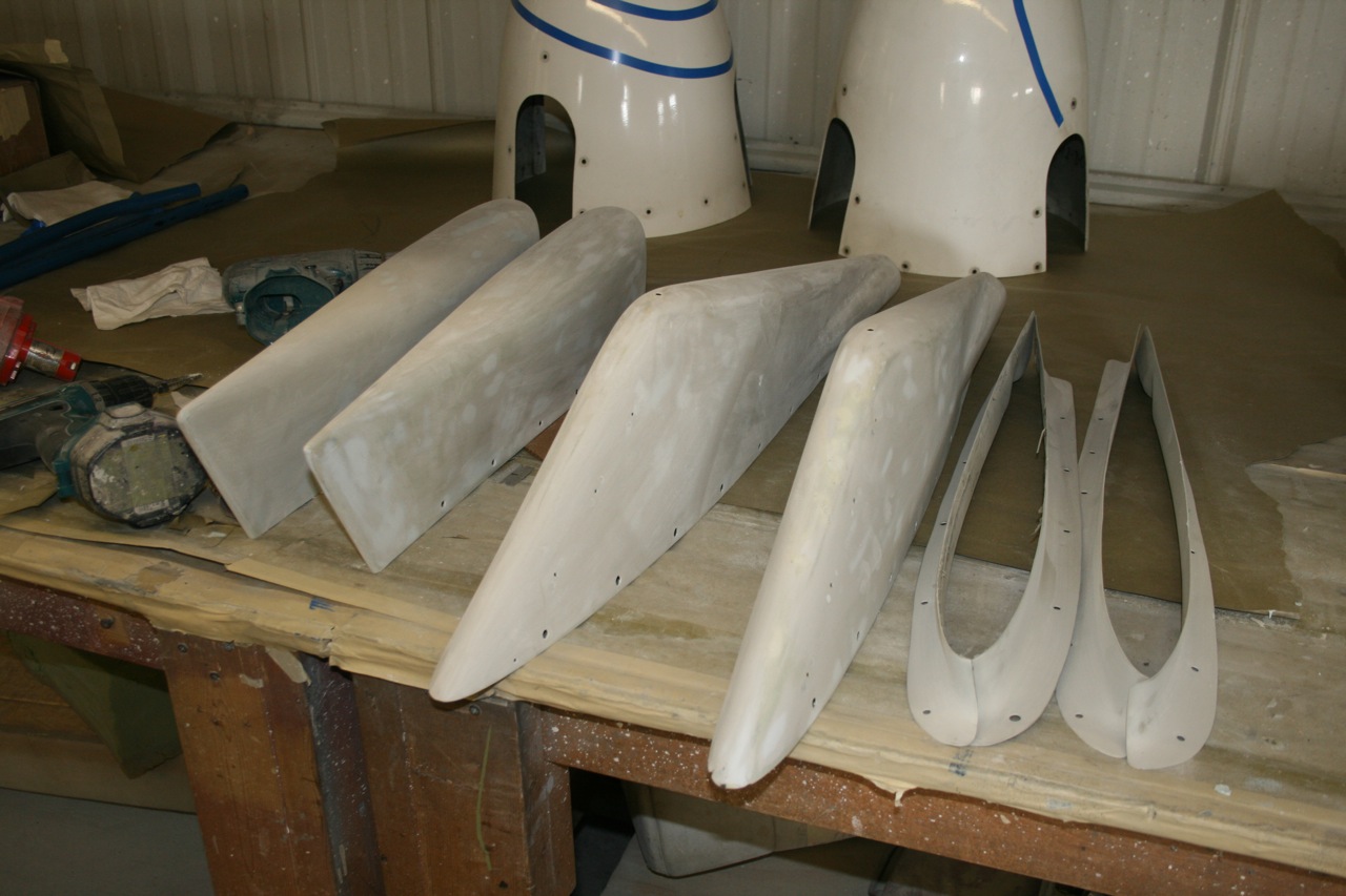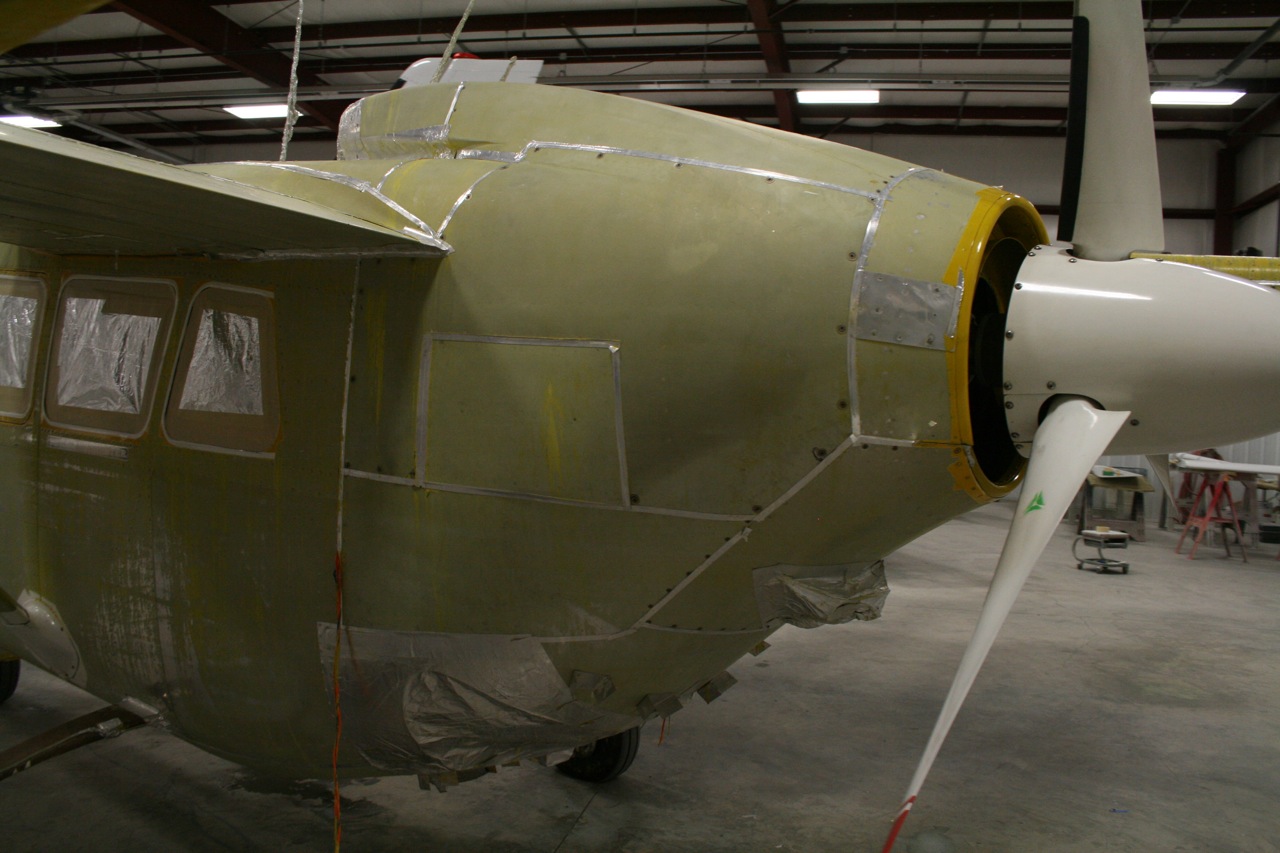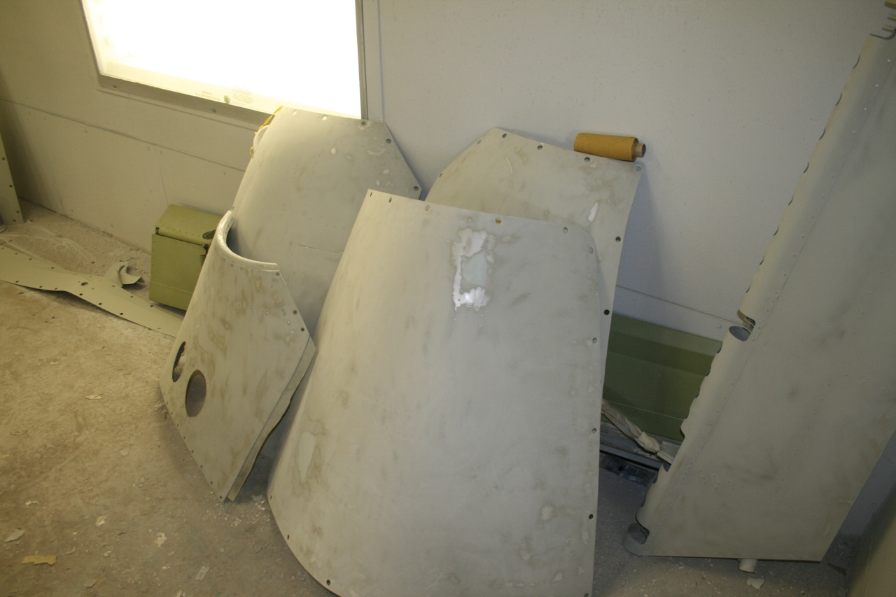 Here are some photos of the primed aircraft awaiting the first coat of paint tomorrow. They took the whole skin to bare metal, and applied a Chromate Primer first. After that was cured then the sanding primer is applied (as in the photos). At this point today they were searching for every miss imperfection they could find to fill and smooth. Using a bright flashlight they scan the entire aircraft for any spot that needs attention. Once they find something they mark it with a sharpie and the fill and sanding crew takes care of the blemish. The one guy that was doing the inspecting said that he could not believe how good the aircraft was. There were very few places to prep. All the plastic and fiberglass was removed and taken to the control / small parts shop to be prepped for paint. These will be painted separately and then installed to the aircraft. The front fiberglass nose parts were looking pretty shabby from the last 41 years of use. When I saw the repaired nose parts I thought they bought new units. They had completely refurbished the fiberglass. It looks really good and it's not even painted yet. The detail that this shops puts to each part is amazing.