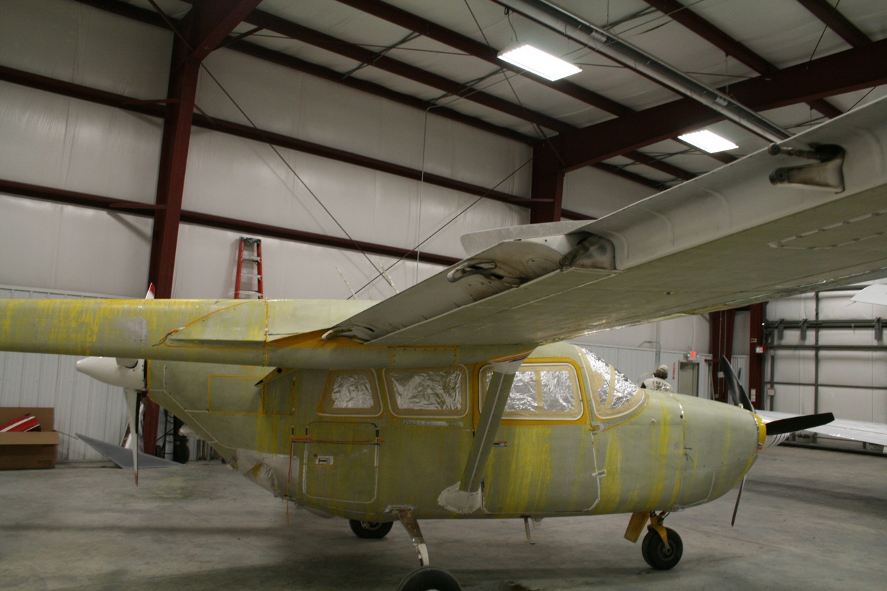 It sounds like it will be about 4 weeks to completion. Can't wait!!! I delivered 2JF on Saturday and today was my first visit back. After complaining about driving to Larry's for the last 4 months, I now have to drive another hour past Larry's to the paint shop. I know whiner. Anyway they had the paint stripped and were removing control surfaces. I have one flap that has a boo boo so off to the control surface doctor. Wow, that is expensive work but it has to be done. I am not going to paint something that is wrinkled. This shop has some real good people. They are painting a Citation, Mooney Aclaim (both touch up stuff) and a full job on a AT-6. This isn't much of a load for them so the Skymaster should move pretty quickly. I will be replacing any screws that have to be removed for inspection with stainless. Even the cowling latches will be stainless. I am doing a neat design on the spinner for a little pizazz and going with the #3 paint scheme.