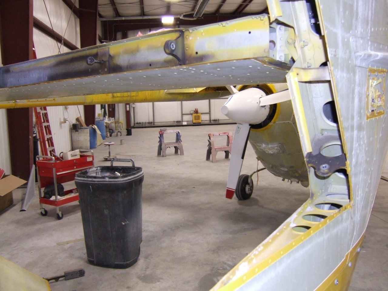 Well it's been 2 weeks and I have not seen the progress I had originally hoped for. I had a Citation in front of me and it's gone. Now the T-6 and it's just starting to get squirted. They have all the controls removed. Cowling is all off and the labor is starting to tackle the original paint. Lacquer. It's a four letter word in a paint shop. The original paint is lacquer from Cessna. It cannot be removed with power tools. It has to come off with good ol' elbow grease. Even though they did the chemical strip, all seams, every seam on the plane was taped to keep the chemical from migrating into the airframe. So the earlier photos above make it look like no big deal but while I was there yesterday it is a big deal. I worked on a couple spots for a long time and not much progress. The use MEK to remove the lacquer. Once the lacquer gets a little soft then it can be scrubbed with a scotch bright pad to help speed up the slow process. I have a deadline date and they promise they will make it with no problem. The new paint will be Polyurethane. The use JetGlo by Sherwin Williams. For some accent and stripes they might use Imron (Dupont) but the JetGlo is the standard. Lots of detail and they know their stuff. It has been a real interesting process so far.