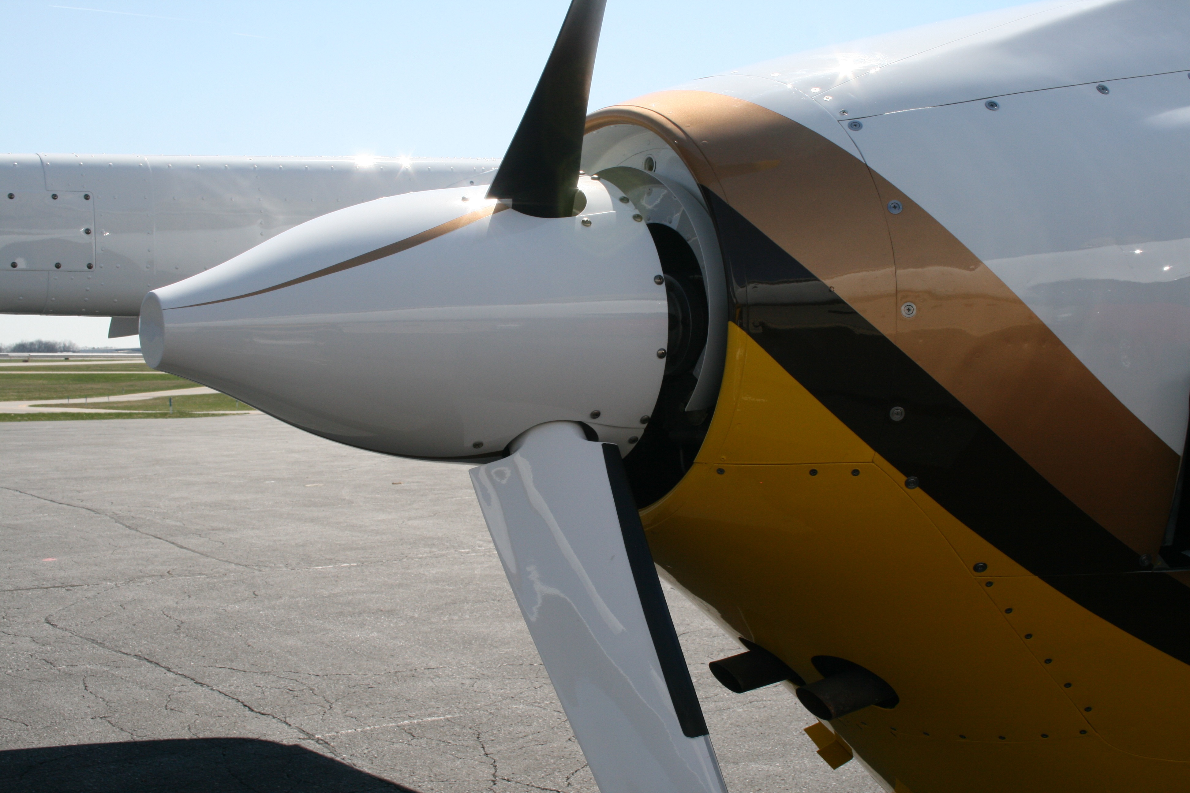 The spinner design was an idea that Larry and I had. Something to kind of just add a little personality. The rear spinner is what I had envisioned with Larry because of the MT blades angle to the spinner. Each blade with have this photoed stripe and will be painted in the dark brown. The front spinner was going to be a corkscrew, but after I did the rear I decided I liked the photoed version better. Again continuity, fun stuff! The front spinner will be yellow stripes. In some of the photos you can see the N numbers stencil on the boom. Those will be painted in dark brown too.