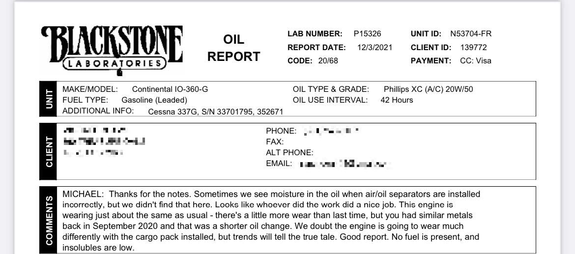Another thing to consider is an air/oil separator on the front engine. You may think the breather isn't putting much out until you put a white pack on your belly. I put the AirWolf separator on my airplane. They don't keep the 337 kits ready anymore; it took about two weeks for them to build it. Without going back to look, I think it was about $600. It has kept the pack super clean. I didn't want the separator as they are known to create moisture issues within the engine, but it lived up to AirWolf's and Aviation Consumers' claim (see attached Blackstone report).
