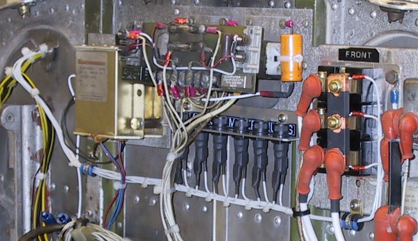 I also installed an EI-VA1 volt-ammeter with the three-way switch for front, rear and battery current. I left the factory warning circuitry in place. I happen to have a picture of the shunt installation that I took when the front engine was out for replacement recently. You can see that I installed the shunts by stacking the front regulator on top of the rear regulator with spacers for cooling. I then made an aluminum plate with mounting holes that matched the regulator and attached the three shunts. I then built a bracket to hold the 6 required fuses.