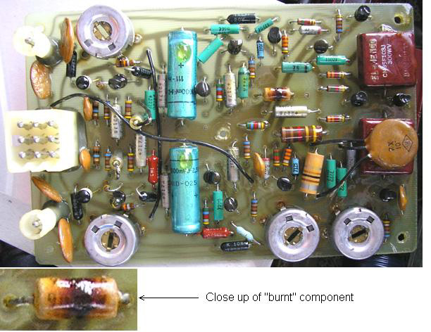I too suffer from erratic fuel gauges on my 73 with capacitance-type senders feeding a signal conditioner (P/N C668004-0102). Because typically the guages go to zero together, we started out by tackling the signal conditioner. Found all connectors OK so we opened the box and found a component whose discoloration suggests that it's burnt (see figure below). Hard to believe that this is it, since 30-40% of the time the guages read accurately, but we'd like to change out the component. Problem is, we can't read what it is. If anyone has a schematic or knows what the component is, please let me know. Meanwhile, we're going to look at the other suggestions, namely the inboard wing connectors and the long plug behind the guages.