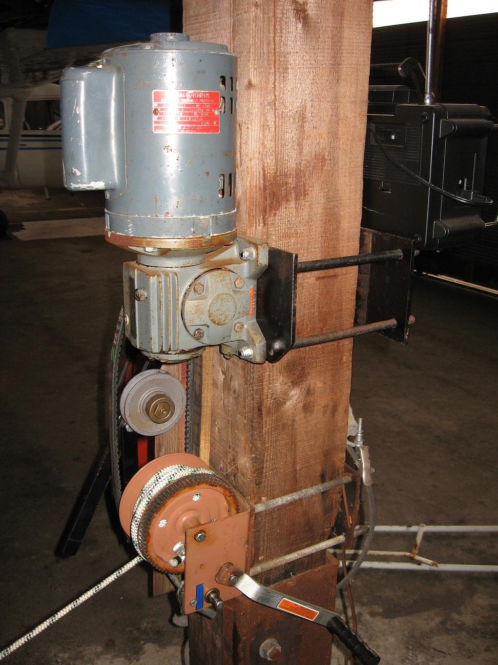 I took a 110 volt gear motor and put a pully on it. Then I took a boat winch and extended the shaft and put a pully on it and made a tension arm with pully to connected the two. I can use the gear motor or if the power goes out I can mannully winch the plane in
