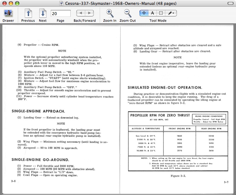 No argument from me on either of your points. Don't make assumptions is a good point. In my case, I also don't fly at gross wt. too often, and so also hope for book numbers. But out of curiosity, when I bought the plane, I took it up with an instructor to see what it would do. I was pleasantly surprised, but we were pretty close to gross wt., and the plane did climb at 100-150fpm with the gear down on the rear engine. Later, when I lost the rear engine on a go around in instrument conditions, it climbed out at 350fpm on the front engine, probably 250lbs under gross on a cool day. Turns out the fuel was set up way rich on the rear engine and it choked when I gave it power, came back when I leaned the mixture, thankfully. Made me a Skymaster believer though! Fuel set up is better now too. I am still not sure what the best course of action is with the gear though. I usually leave it alone until all set for cruise climb, then retract it. When I asked about this at Recurrent Training Center, they made the argument that getting the gear up resulted in better climb, and altitude is your friend, and so had no problem with positive rate gear up. They weren't unhappy if you waited either. I guess to each his own. I can wait to pull up the gear myself....