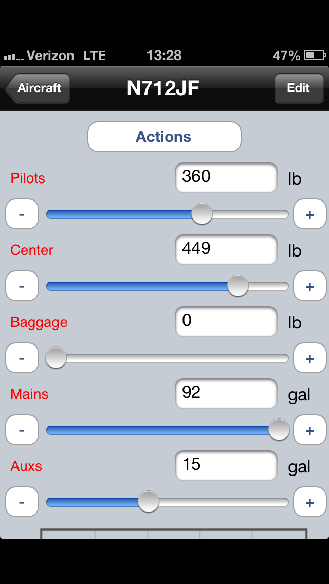Here is a screen shot of the spreadsheet I use. The neat thing here is it's all on one iPad screen plus it has a quick fuel calculation at the bottom as one is often juggling load vs distance / fuel. You can email this page or take a "snapshot" of the page for future reference. (Press 'home' button and on/off button simultaneously to take a snapshot on an iPad). This spreadsheet is in kg lit & knots for Australia. I have a version in lbs & gal only for USA.