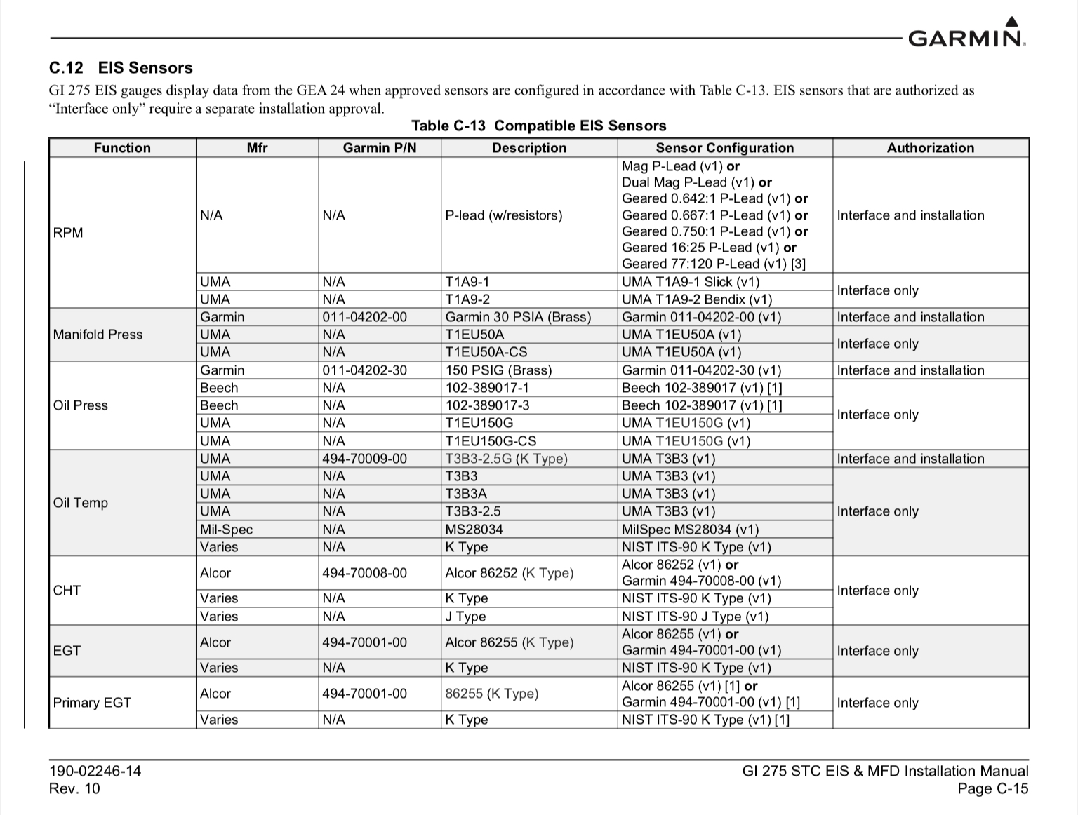Hey LearJet, I am looking into getting a pair of GI275 EIS's... quick question about the MP sensors... Yours were ok out of the box since your plane is NA? I have turbos on mine and my MP gauge redlines at 37in with a top of 40"... garmin only has a 30" sensor....I cant find one to go as high as 40"....I know I will never see that but I do redline on TO. |