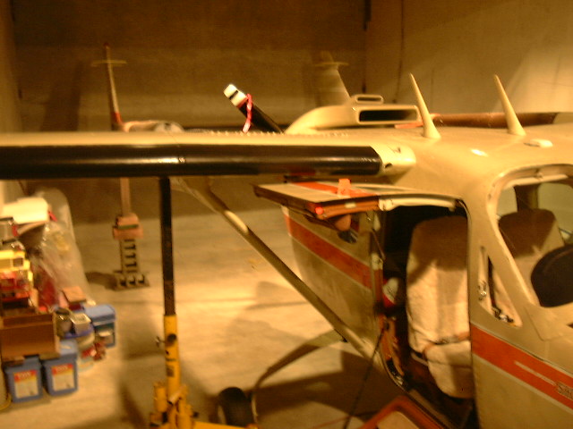 Here we see the boom support... kinda crude looking, but it did the trick... with a nice big cushy soft rag on top of the 4X4. The jacks were also placed under both wings. The Service Manual gives you a good explanation why this is necessary -- before trying to take out or reinstall the ga-zillion screws on the tank cover.