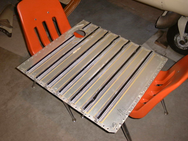 Here's the underside of the inboard tank cover... notice the "HAT" sections with the anti-chaf tape... these "HAT" sections provide carry-thru strength of the wing structure across the top of the tank.