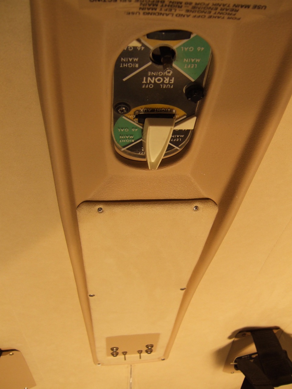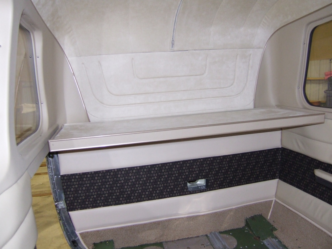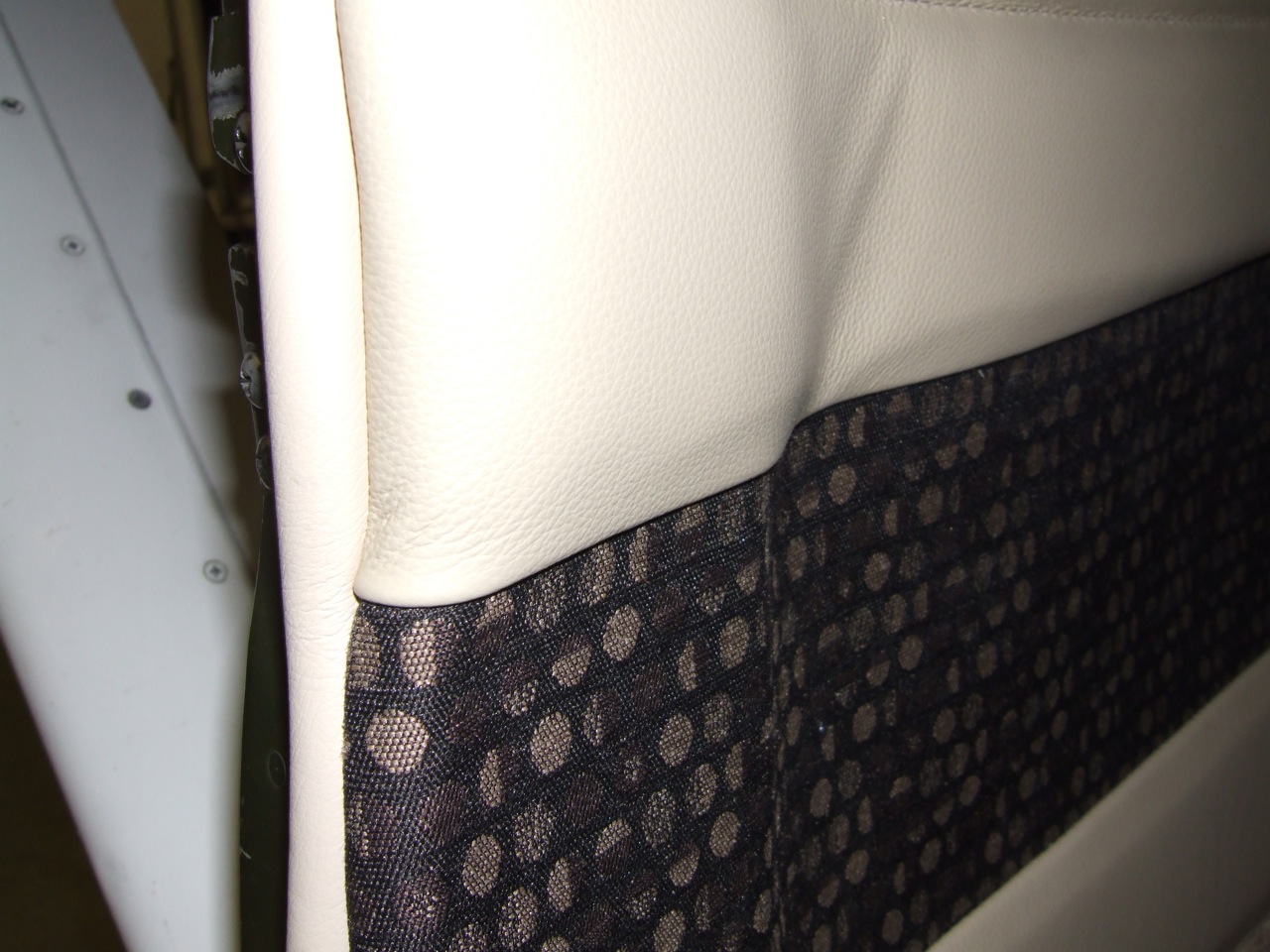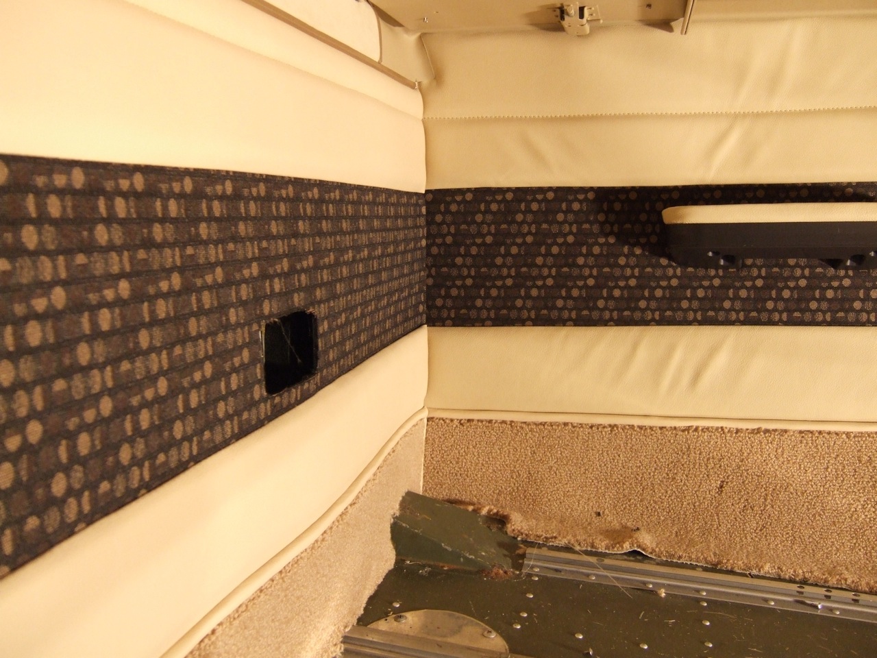 The interior continues to make progress. Although finishing yesterday was a dream. That's ok because I am still not in a hurry. We had problems with the original interior light switches. Cessna really went the extra mile with these stylish slide switches. I guess I shouldn't complain, they are 40 years old. I had new switches from aircraft spruce that I bought but once they arrived they were only rated for 12VDC. Although they were rated at 25 amps I just decided that the originals were still good so I wasn't going to change something that wasn't really approved. Anyway, the pilot map light switch decided to come apart while trying to re-install the window trim that it mounted to. After fiddling with it for what seemed like hours, checking to see if it worked, cleaning the contacts, lubing it so that the action was easier we finally had it installed. Just small incidentals like this can really eat up your afternoon. Of course it's Valentine's Day so my interior tech and his son had plans with the lady's so about 6 PM it's done for the weekend. Well some progress was made as the photos below testify. I am really liking what I see. It's going to be one of a kind. The leather that was chosen is really nice, soft with a casual texture to it. We decided that wrapping the windows was going to be really difficult based on the plastic frames. Cessna has more curves and angles and to wrap these would leave several seams in many directions. We were going with an raised stitch and it would have created quite the railroad track look. So after painting one of the plastic trims and seeing how it changed the look I decided that I could live with the plastic window trim. My plastic was really in good shape. The only piece we had to replace was the overhead console. All the windows are original pieces. With the special paint that is used and the offset color to give some nice contrast the trim really turned out nice. It looks brand new. We lowered the carpet line on the side panels. The original line was like 1/3 of the way up from the floor. By lowering the carpet line it allowed us to use more leather on each side of the designer fabric. I am sure it was easier for Cessna to just push the carper up higher and it also may have helped in the sound control over the vinyl upholstery that was original. We make some nice access panels for the main gear area to be inspected in the future. With the advanced use of Velcro these days it's really nice what can be done. The panels are totally invisible looking at the upholstery but it you know they there it's just a tug on one corner and the panel comes off to give a nice access to the area of the gear for inspection.