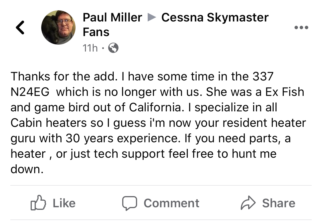 Thanks for the add. I have some time in the 337 N24EG which is no longer with us. She was a Ex Fish and game bird out of California. I specialize in all Cabin heaters so I guess i'm now your resident heater guru with 30 years experience. If you need parts, a heater , or just tech support feel free to hunt me down.