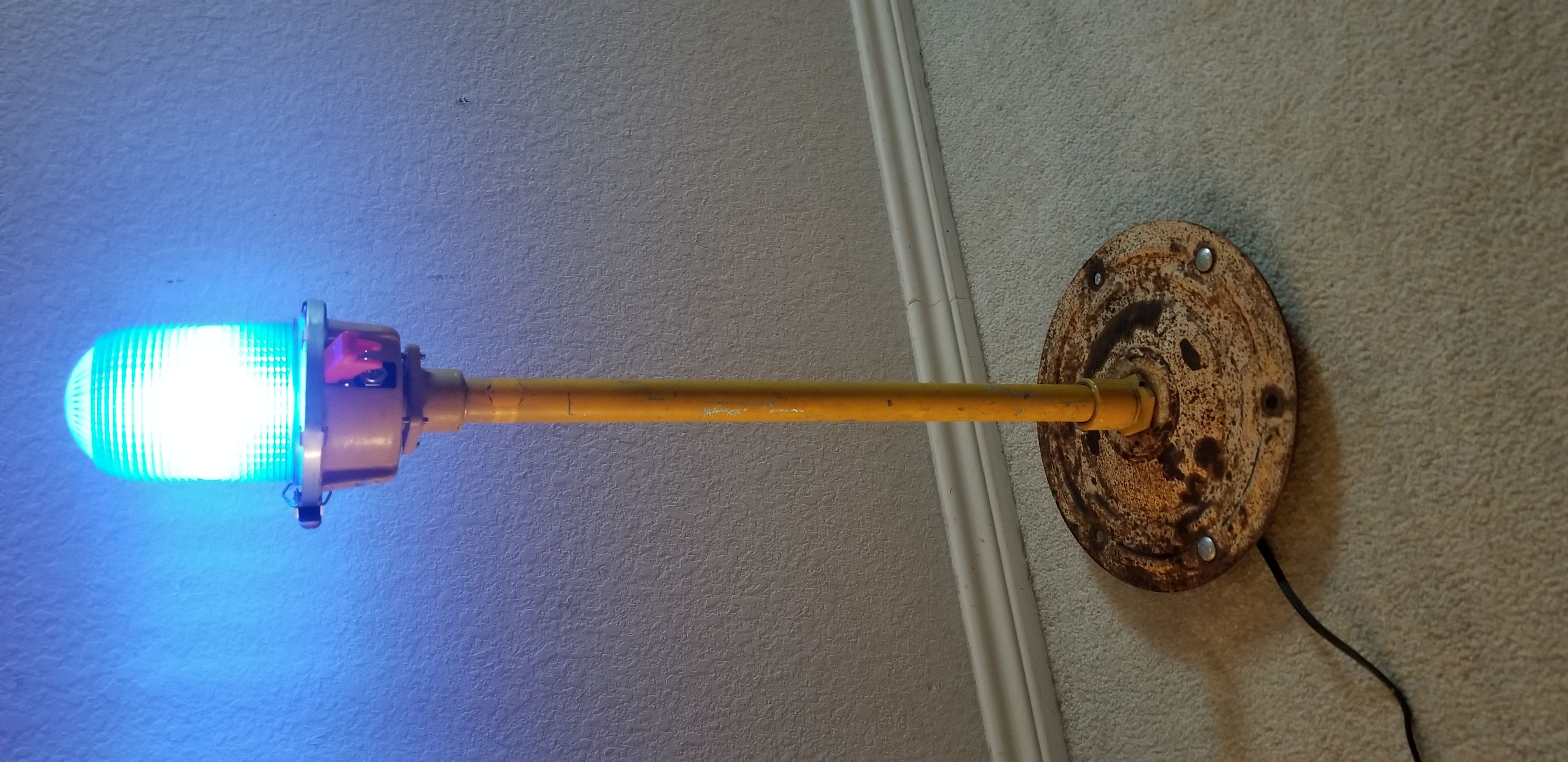 I was inspired by some lamps I saw on Etsy, so I built two lamps yesterday from the runway and taxi lights I bought from the city of Princeton, MN. I added a protected switch, like you would use to arm bombs, guns, or missles as the on-off switch. I replaced the original incandecent bulb with a low watt Edison style LED bulb. Rather than repaint, I left the original patina from 35 years of being outside. I added rubber feet so it won't mar wooden surfaces. I have blue, orange/white, and red fresnel lenses. I intend to build a few more as gifts. If you would like one, I'll make one custom for you for $200. Enjoy!