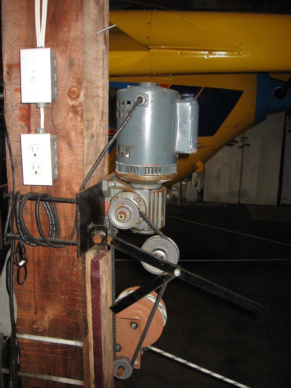 I took a 110 volt gear motor and put a pully on it. Then I took a boat winch and extended the shaft and put a pully on it and made a tension arm with pully to connected the two. I can use the gear motor or if the power goes out I can mannully winch the plane in