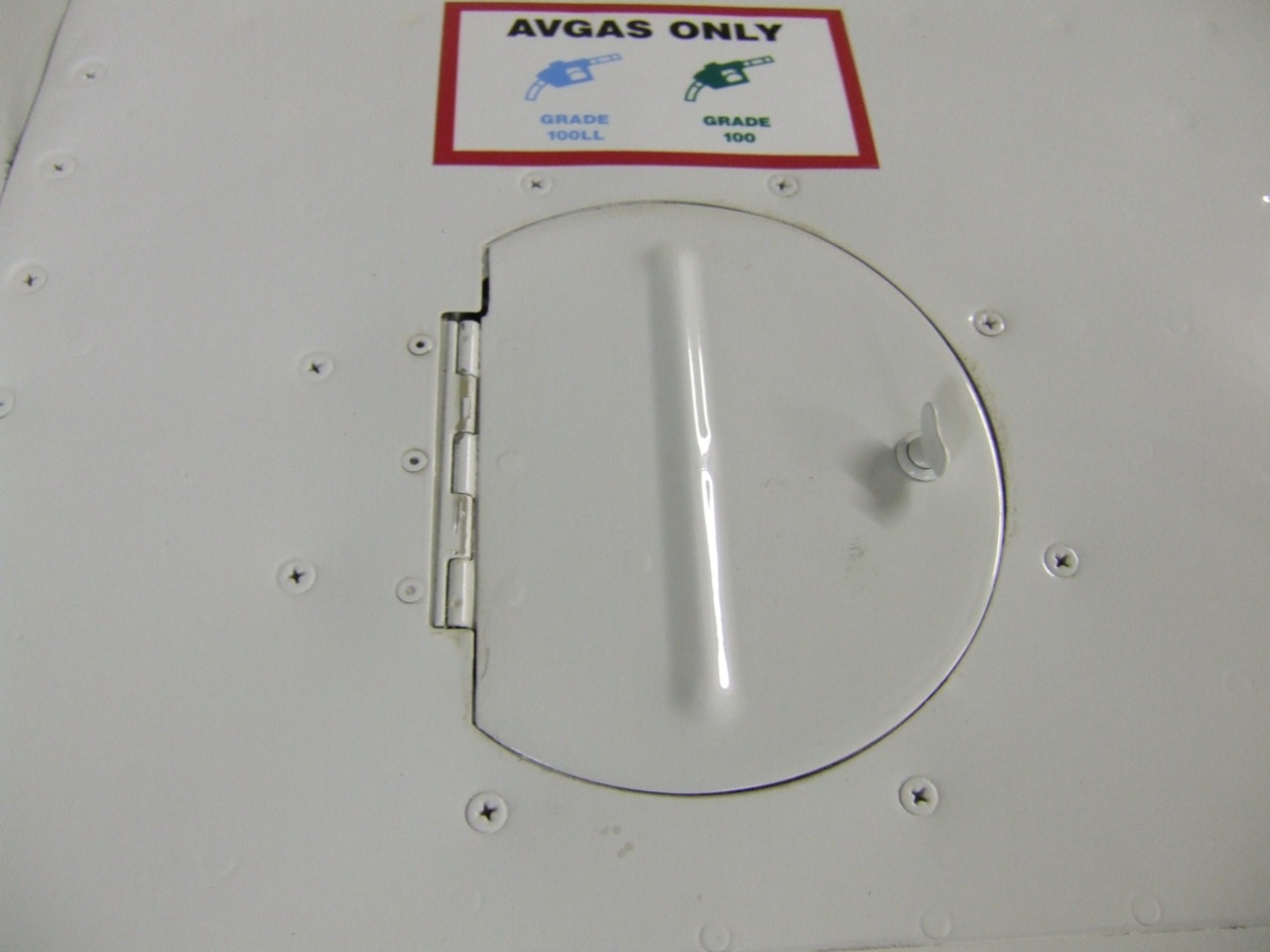The photos show the door over the service port and the door open at the service port. Notice the small hole (drain) at the upper left of the photo. This is the tube that passes through the tank and exits under the wing.
