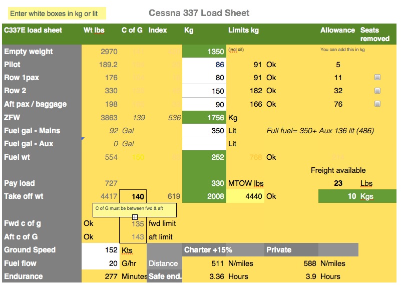 Here is a screen shot of the spreadsheet I use. The neat thing here is it's all on one iPad screen plus it has a quick fuel calculation at the bottom as one is often juggling load vs distance / fuel. You can email this page or take a "snapshot" of the page for future reference. (Press 'home' button and on/off button simultaneously to take a snapshot on an iPad). This spreadsheet is in kg lit & knots for Australia. I have a version in lbs & gal only for USA.