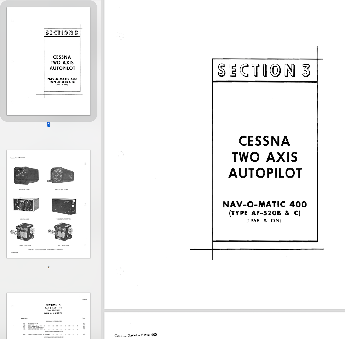 Thank you for the manuals. You won't belief it but I have those on CD. What I don't have is the manual you sent me a while back. I don't know what manual it was but the title was Section 3, with a Fig 3-1. BUT I need the Section two of that manual. That's the pre-1966 model. Any chance you have that one? Also while researching Cessna manuals, I learned that according to the Electronics parts manual the original 1965 C337 lists only the Navomatic 200 and 300. The manual states that the 400 was installed starting with serial number 240+. I think that's a 1966 337A. My 1965 serial number is 200. I've asked one of the avionics shops that I'm working with if I can install the 400. So far no answer. I cannot belief that there are no 1965 C337 with 400's installed. Maybe owners of the 1965 models can let me know if they have a 400 installed???